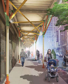 To generate ideas for improved construction shed designs, the Task Force joined forces with the New York Building Foundation to launch an industry-wide design competition in July 2015. Members of the building community were invited to submit one conceptual or schematic design for a buildable construction shed that would be evaluated based on aesthetics, ability to meet engineering standards, functionality, safety, and constructability.