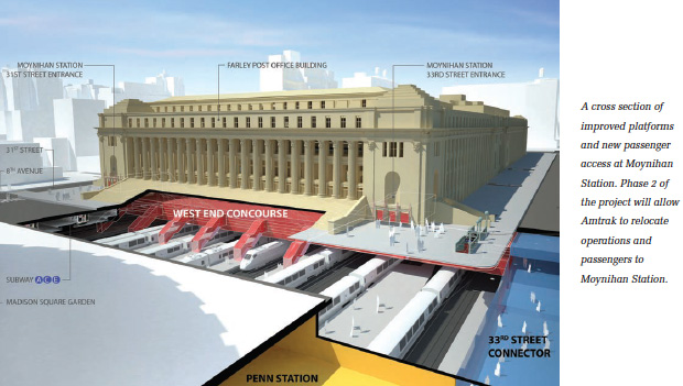 A new Moynihan Station, directly across the street from Penn Station in the old Farley Post Office building, will be the new home of Amtrak. Its completion is an important step toward untangling the overcrowded, confusing conditions at Penn. Phase 1, now underway, will add stairs and escalators at the platform level that will, for the first time, allow access to the West Side through Moynihan Station; modernize passenger concourses beneath Moynihan; and add attractive new exterior entrances, drawing passengers directly into the new station.
